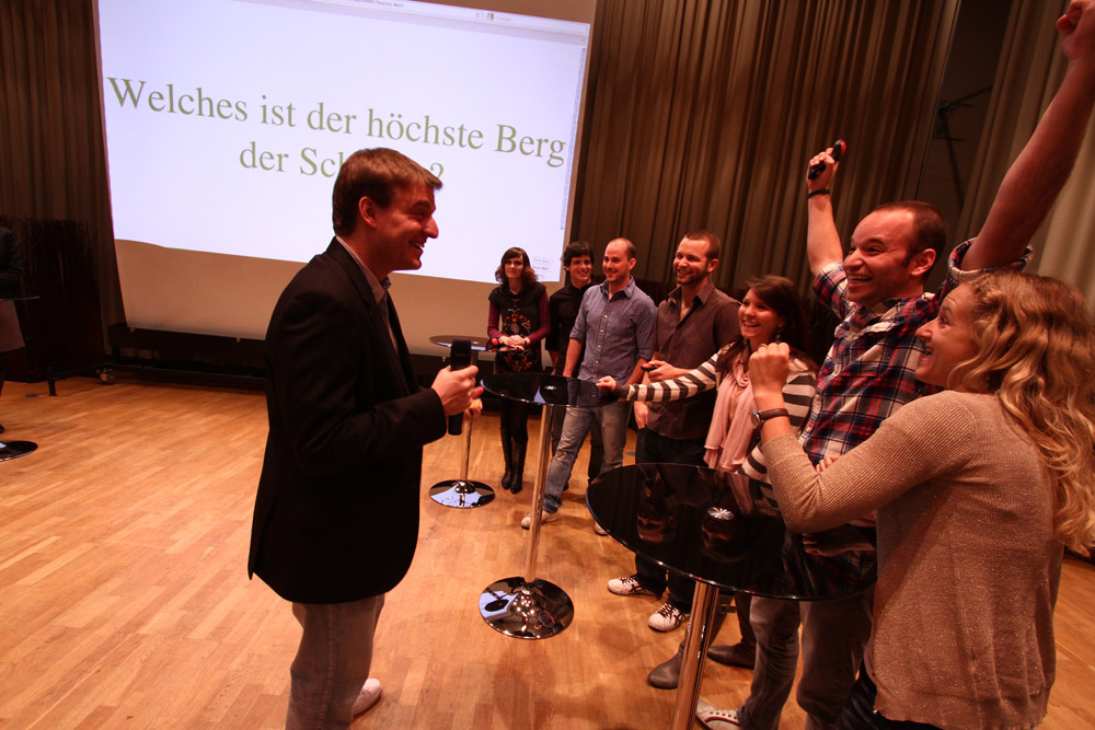 Das Lösen von Rätseln, Fragen oder Aufgaben beschäftigte die Menschen schon seit jeher. Laut griechischer Mythologie war Ödipus der einzige Thebaner, der das Rätsel der Sphinx, welche die Stadt belagerte, lösen und somit die Thebaner vom Ungeheuer befreien konnte. Heute reden wir von „Schlag den Raab“ oder „Wer wird Millionär“. Fernsehen und Radio machten dann erstmals die mediale Verbreitung von Quizsendungen möglich. Früher hiessen die erfolgreichen Formate Tell-Star oder Dalli Dalli und heute reden wir von „Schlag den Raab“ oder „Wer wird Millionär“. Nun ist die Zeit gekommen, für eine professionelle QuizNight an Ihrem nächsten Event. Ob Mitarbeiter- oder Kundenevent, die QuizNight ist universell einsetzbar und garantiert Spiel, Spass und Spannung. Also dann, Achtung, fertig, los